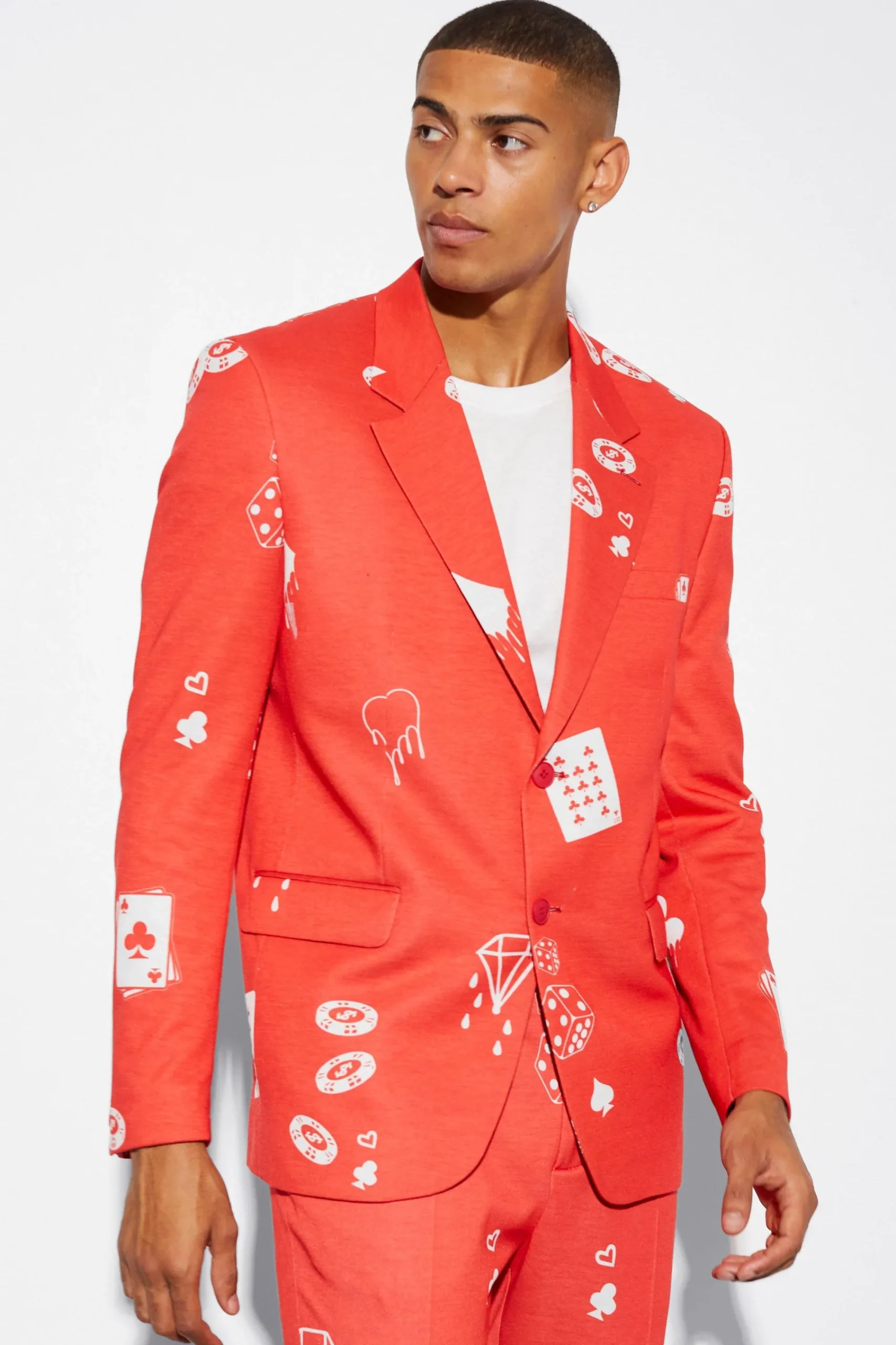 - Match with included slim trousers for full printed suit ensemble