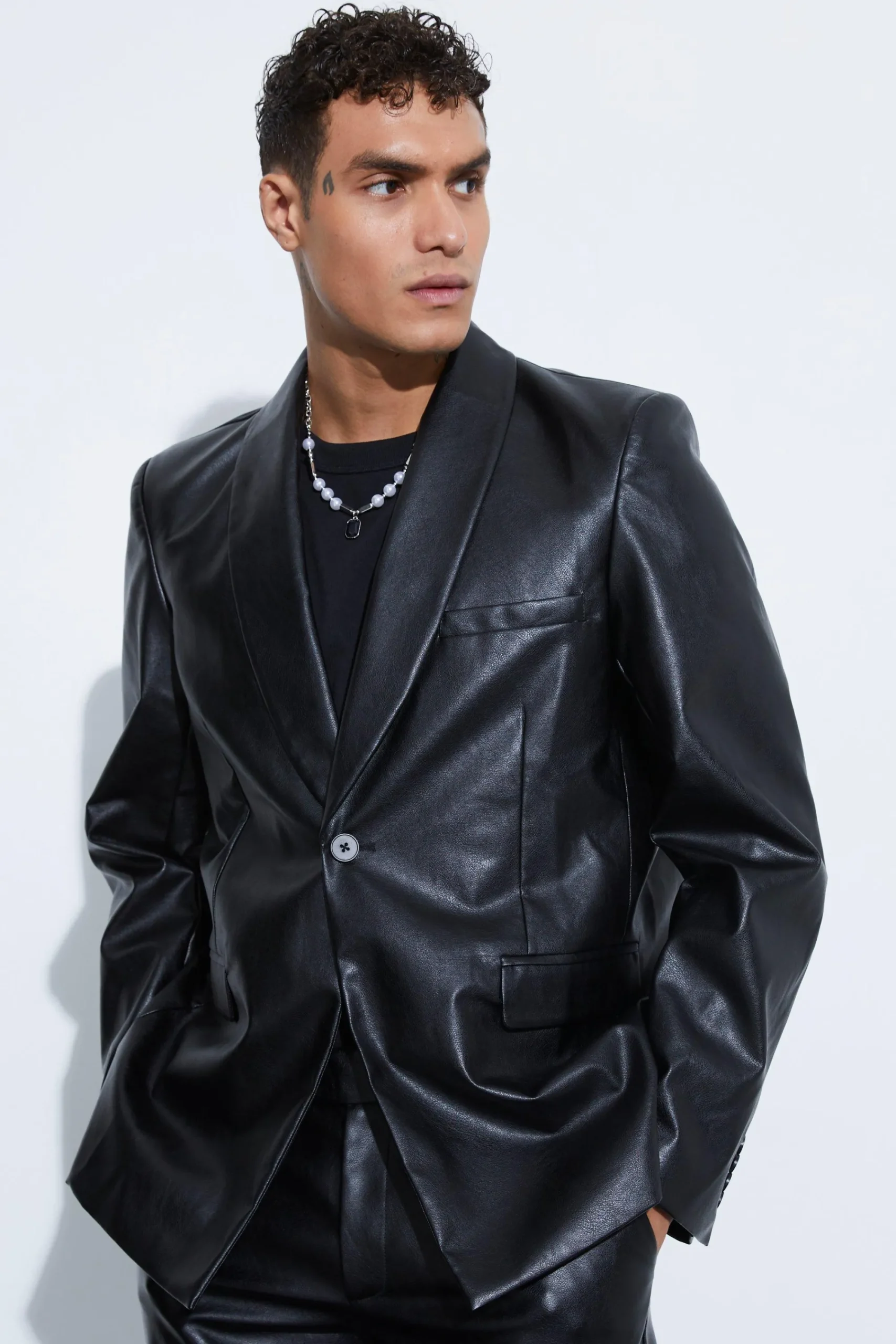 - Eye-catching oversized shawl collar design in smooth PU fabrication