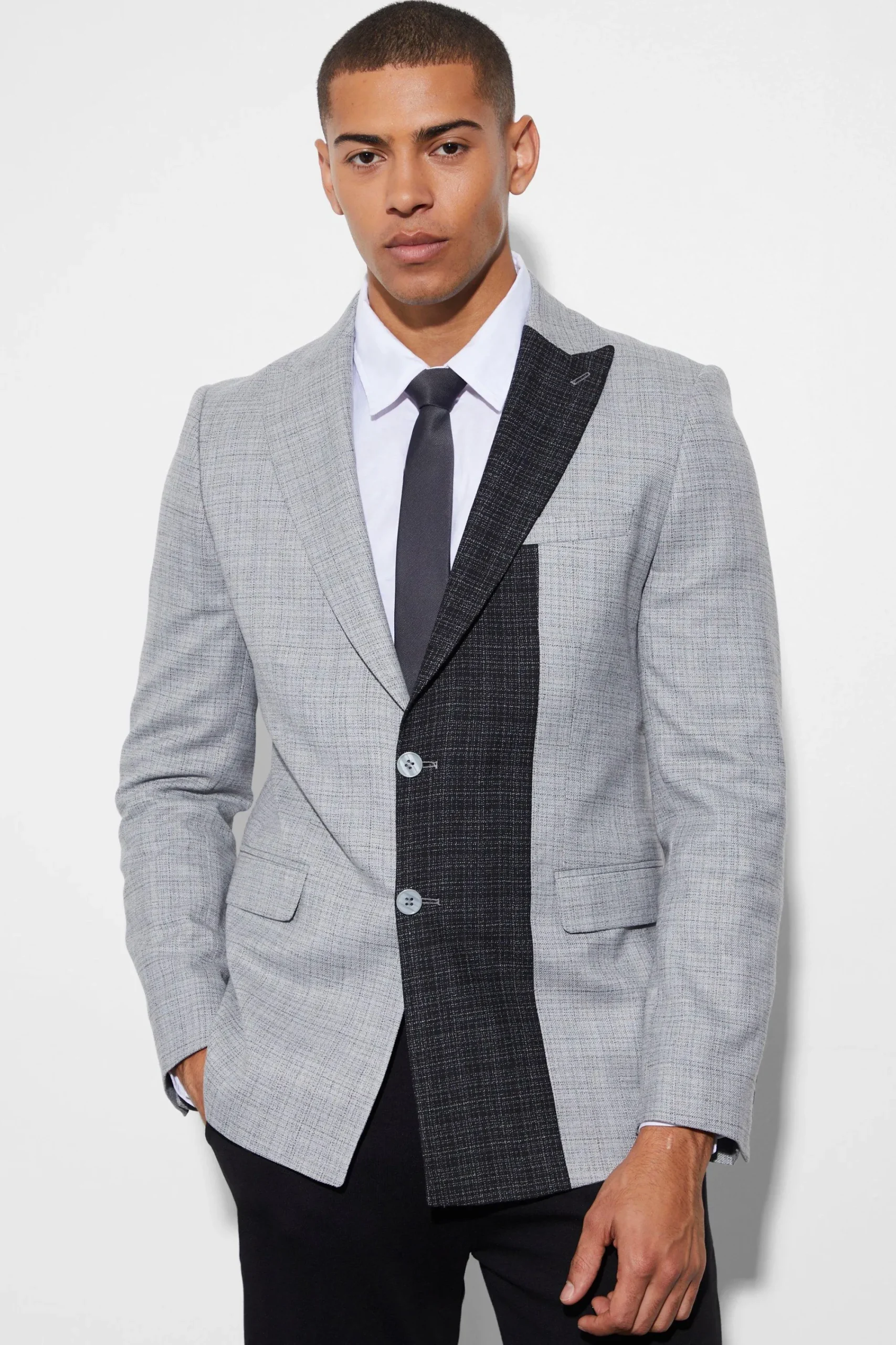 - Eye-catching contrast notch lapel adds modern edge to classic blazer silhouette