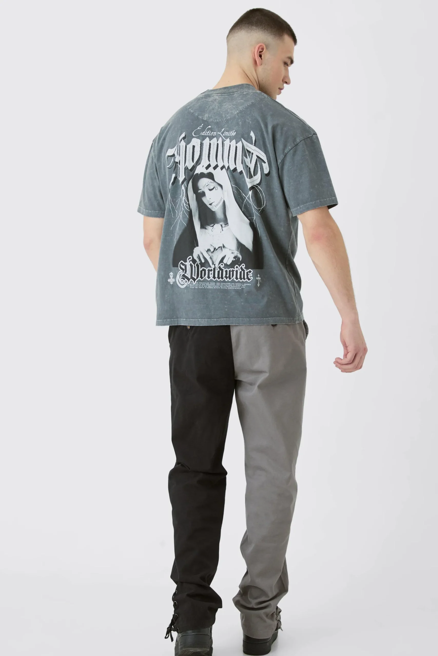 100% cotton. Model is 6″4 and wears a size L.
