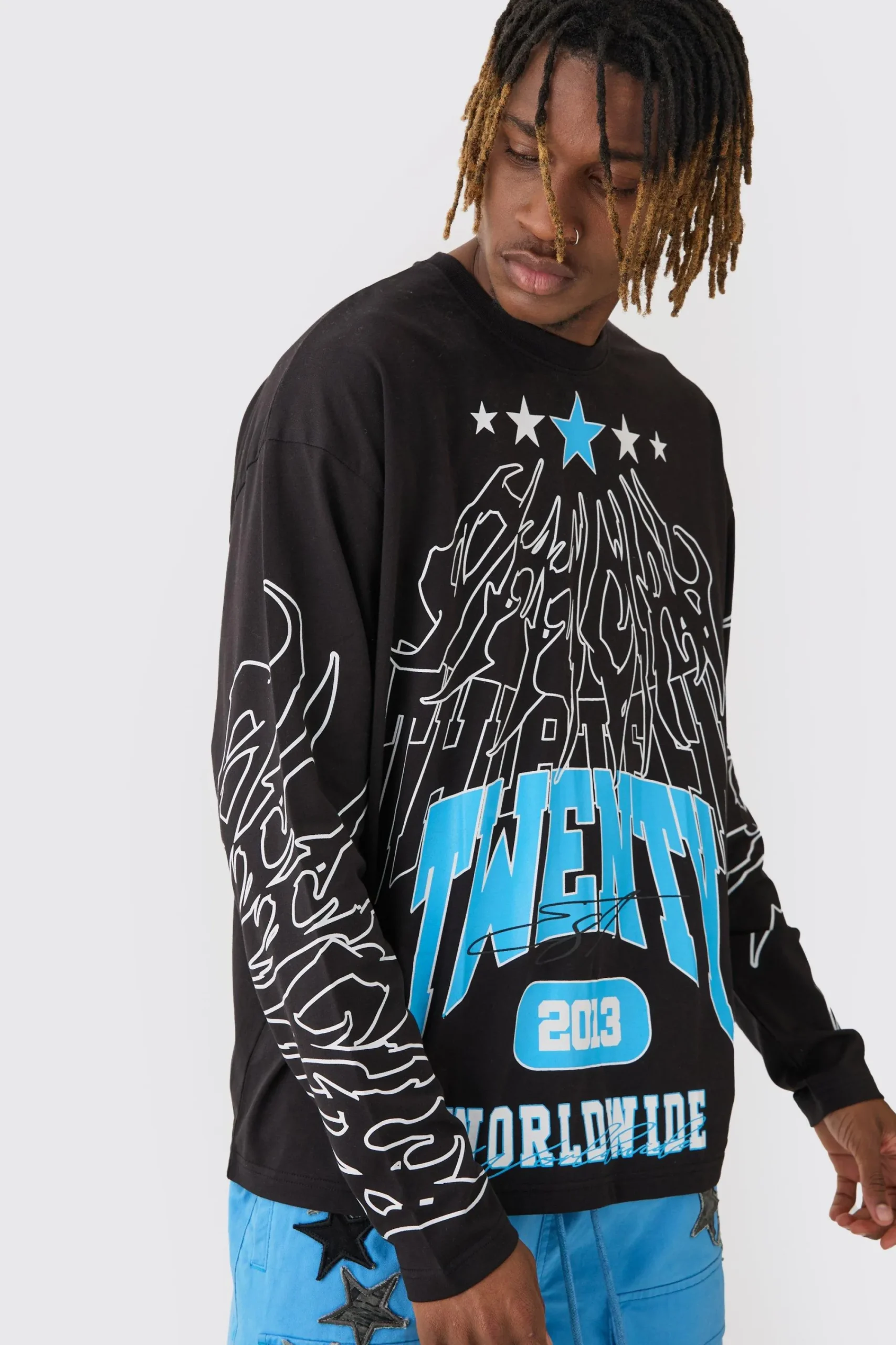 100% cotton. Model is 6″4 and wears a size L.