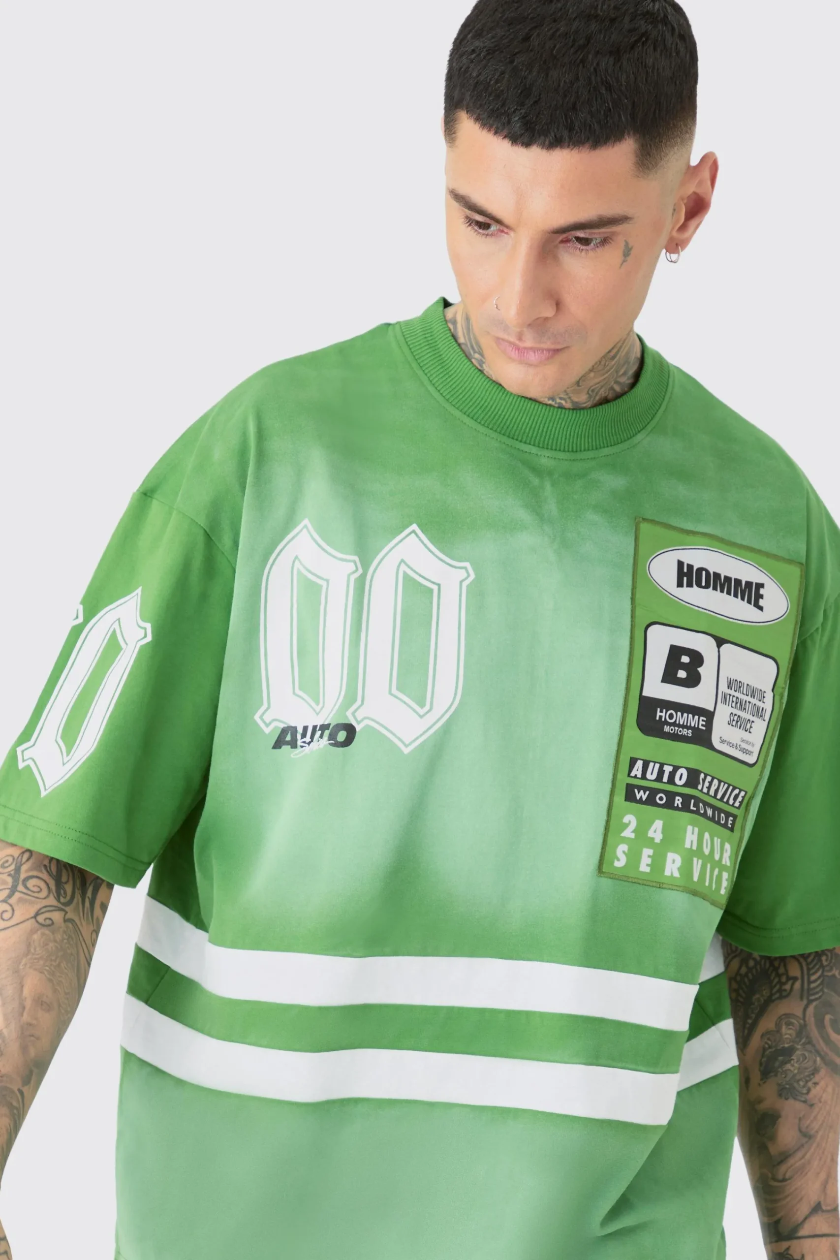 100% cotton. Model is 6″4 and wears a size L.
