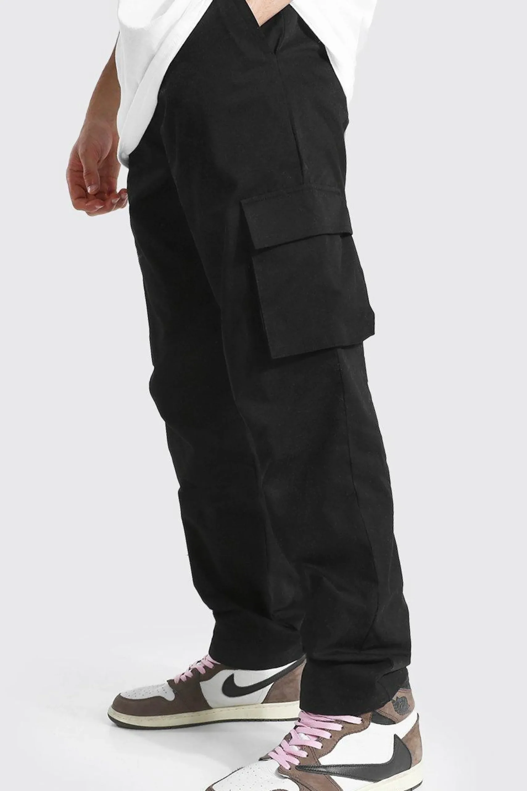 - Relaxed cotton cargo trousers with utilitarian details including multiple pockets