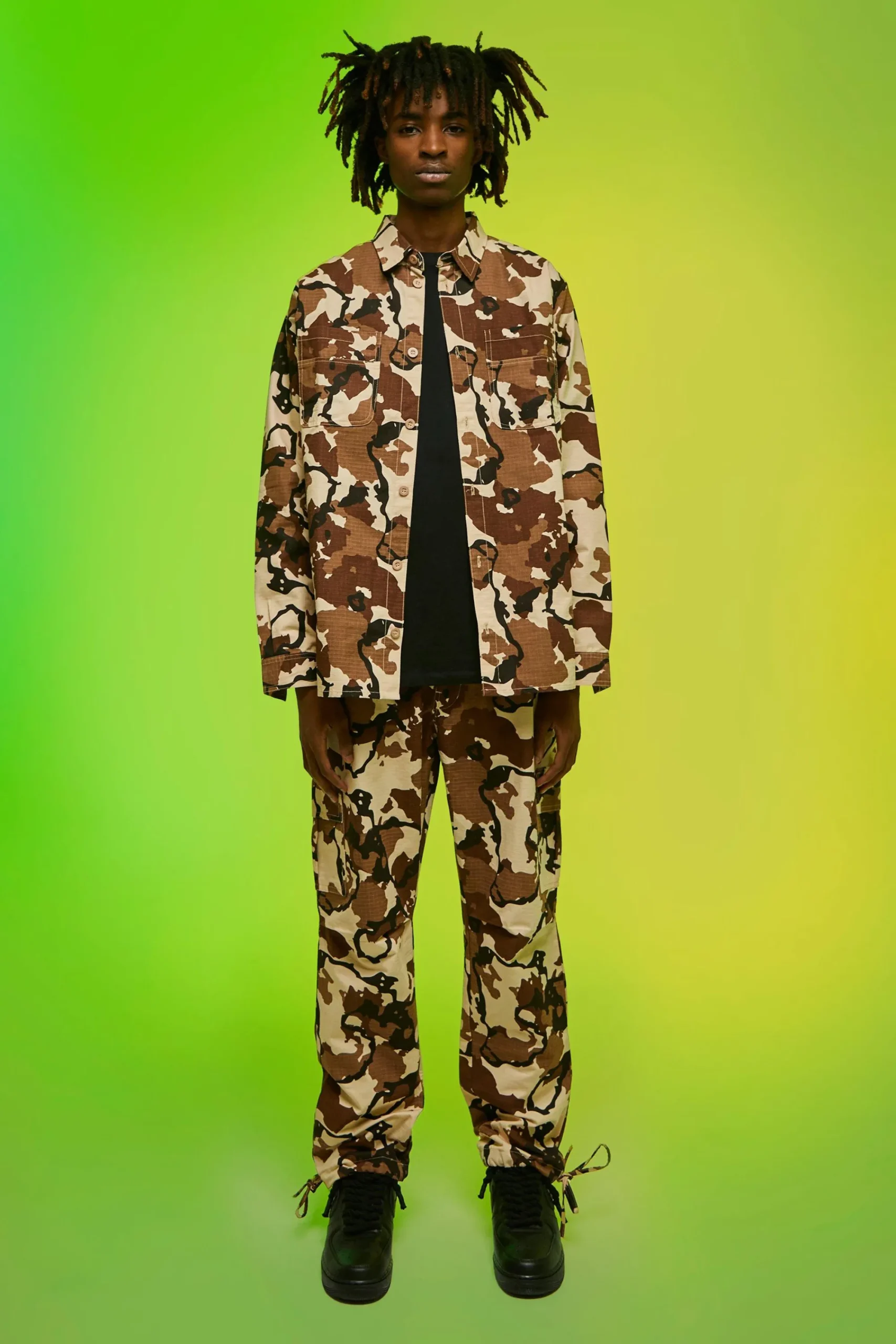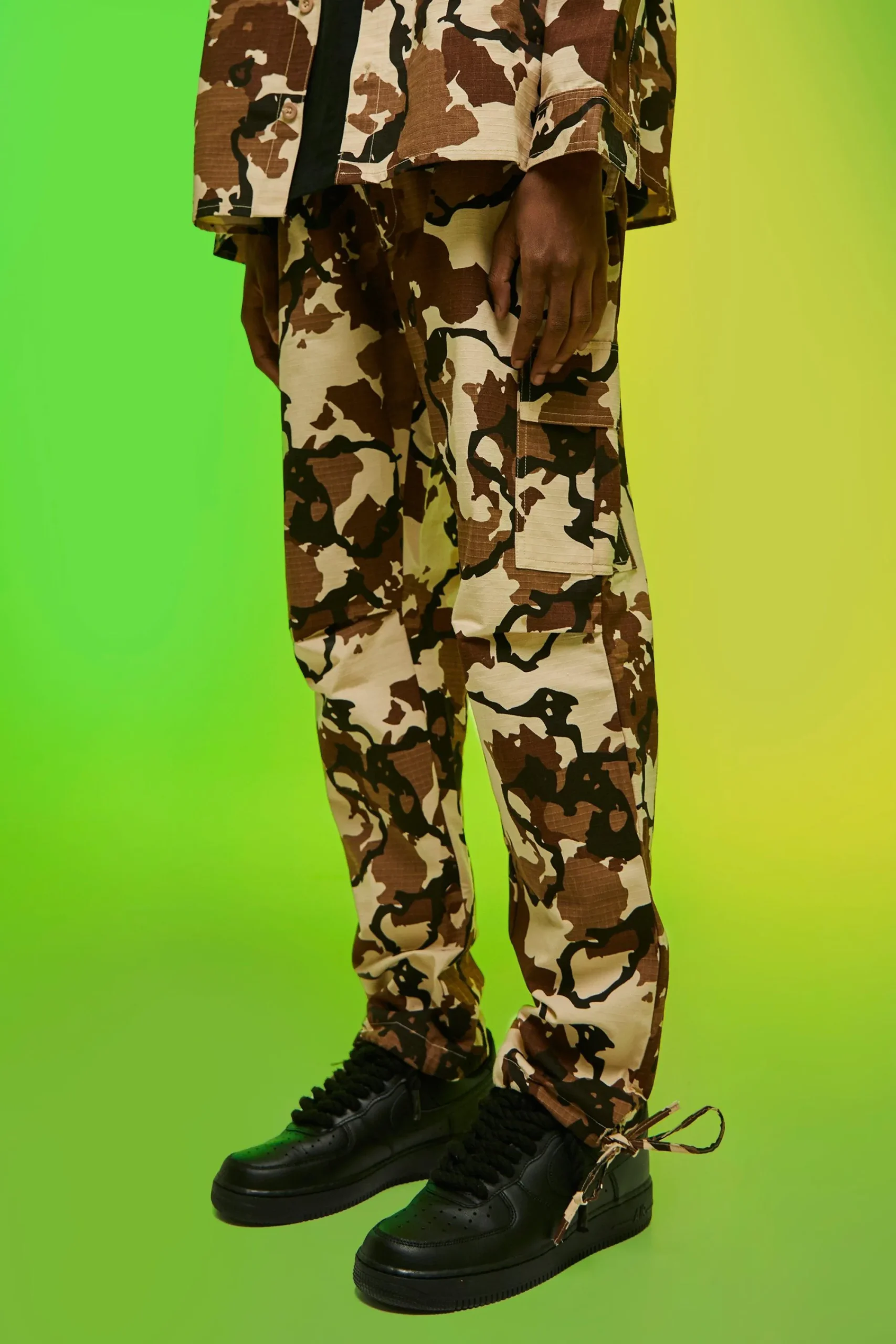 - Eye-catching camouflage print trousers in a unique colour palette of black, white and grey