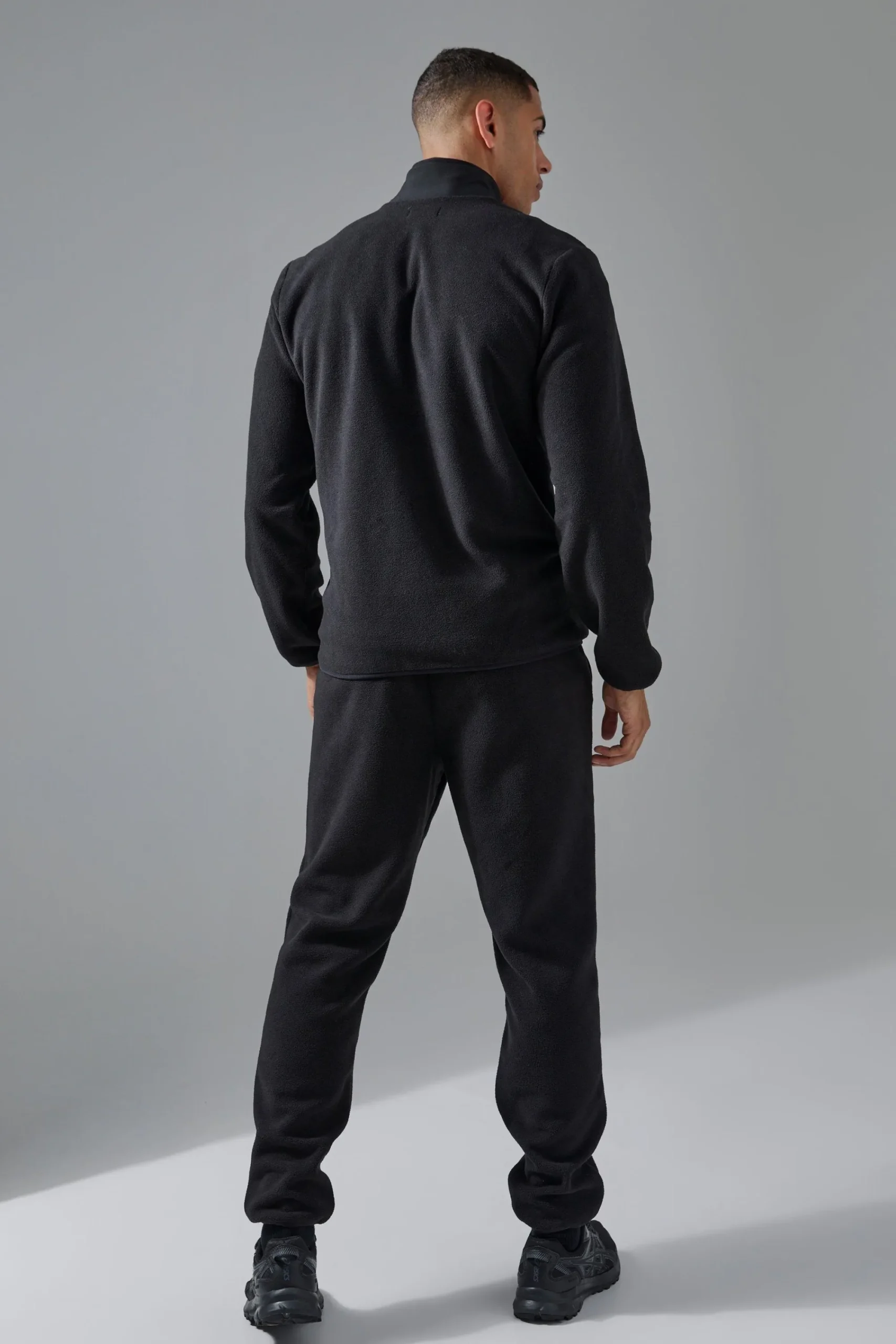 100% polyester. Model is 6’1 and wears a size M.