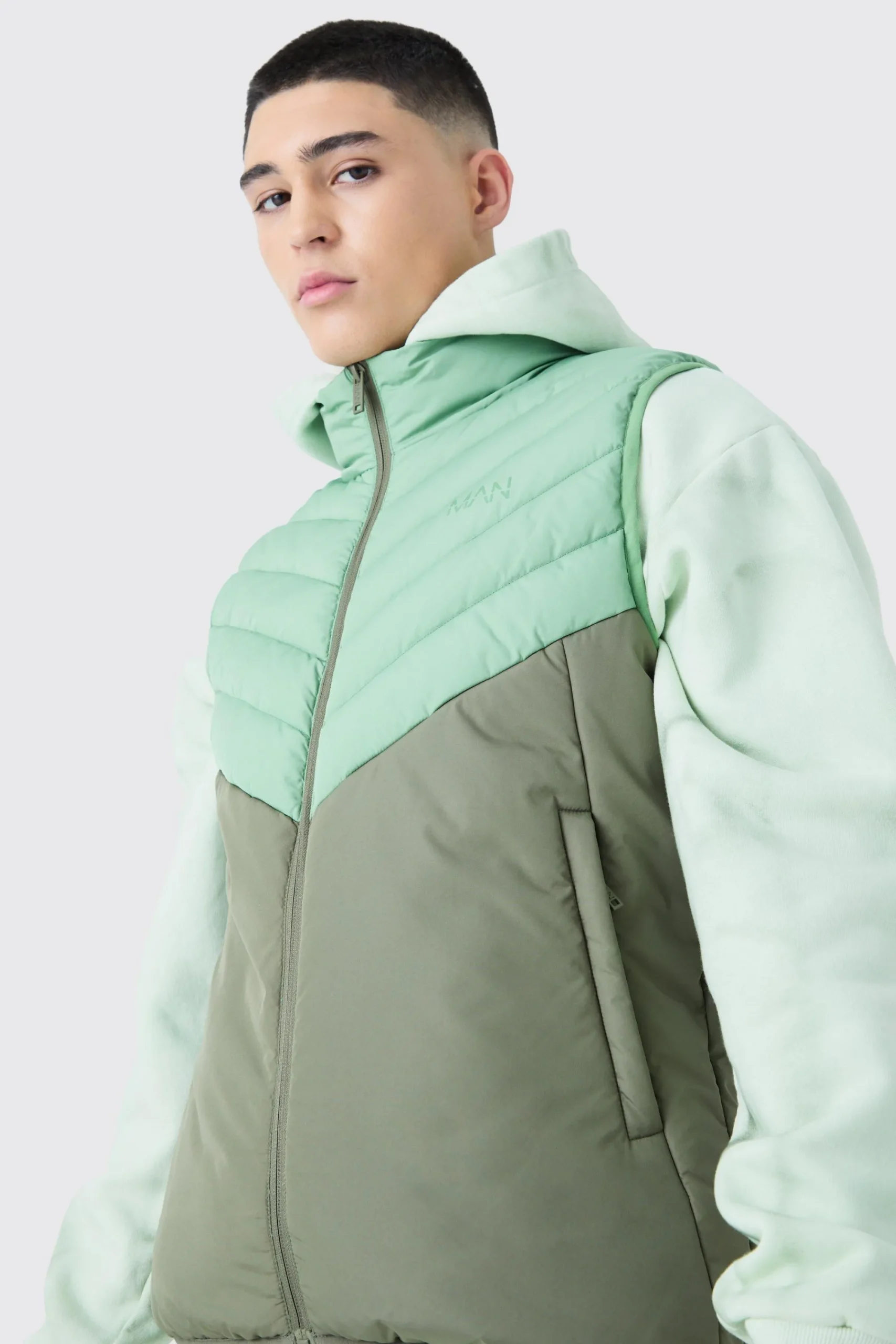 Shell: 50% recycled polyester 50% polyester Lining: 100% polyester Wadding: 100% recycled polyester. Model is 6’1 and wears size M.
