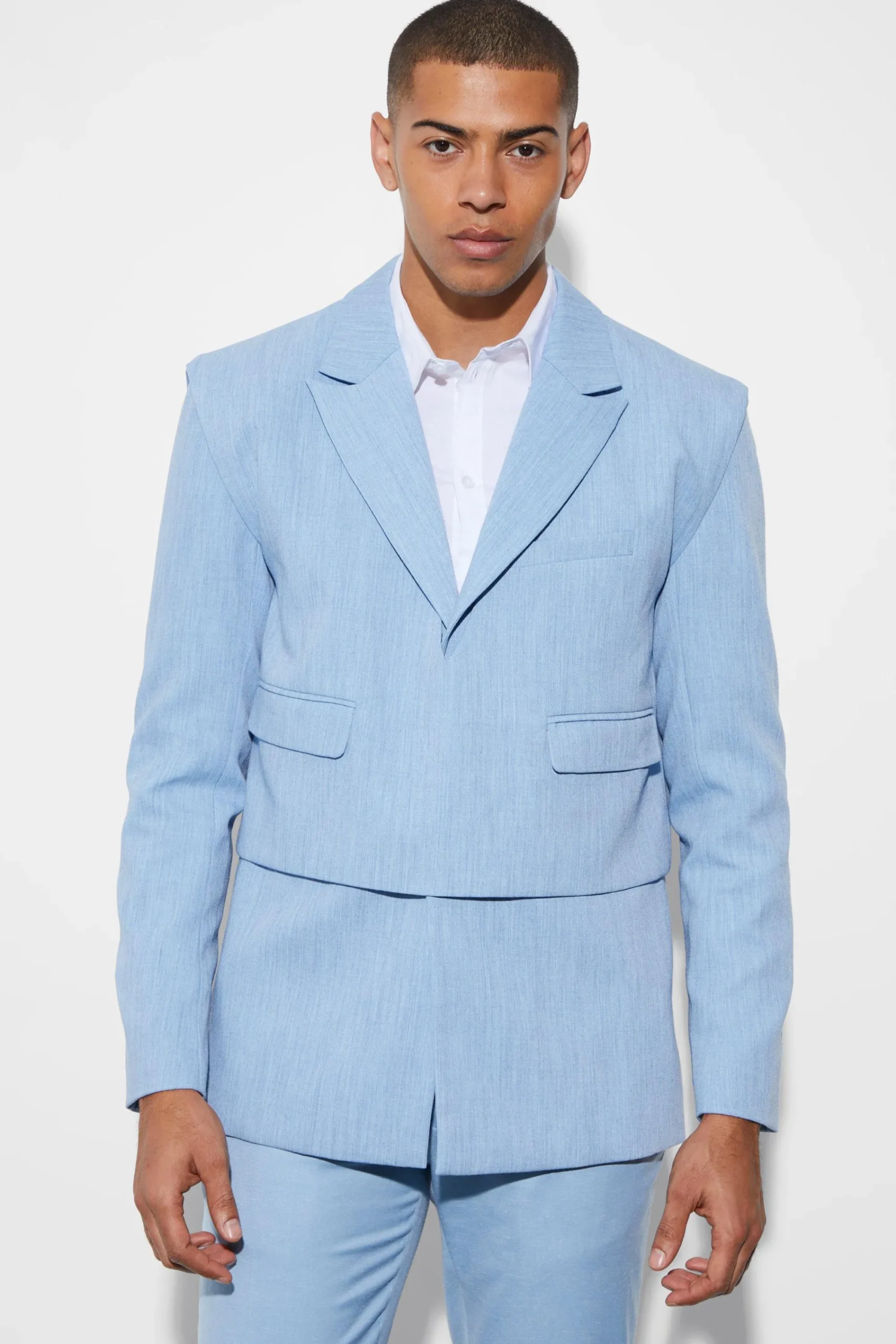 - Boxy silhouette with layered hem for modern edge