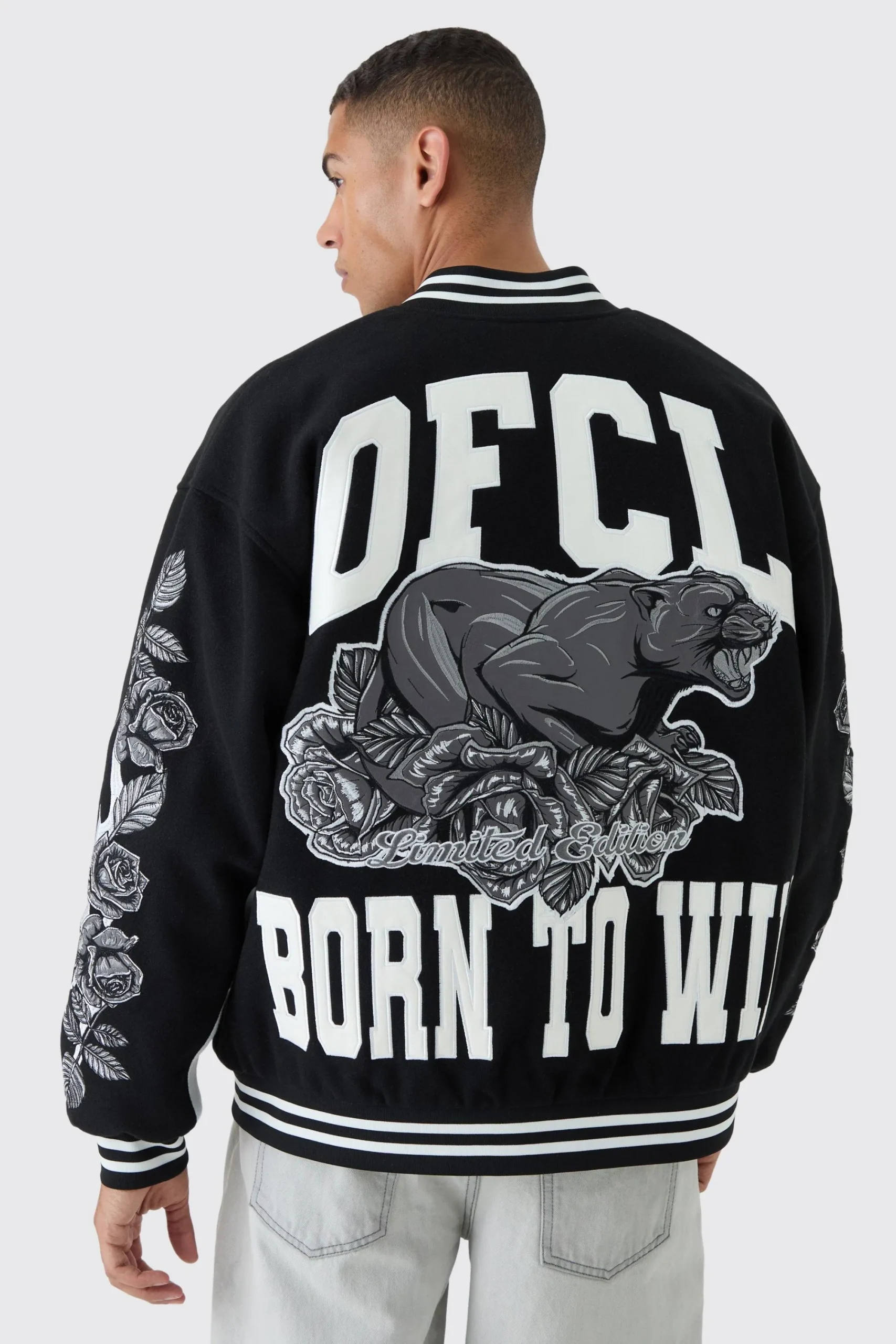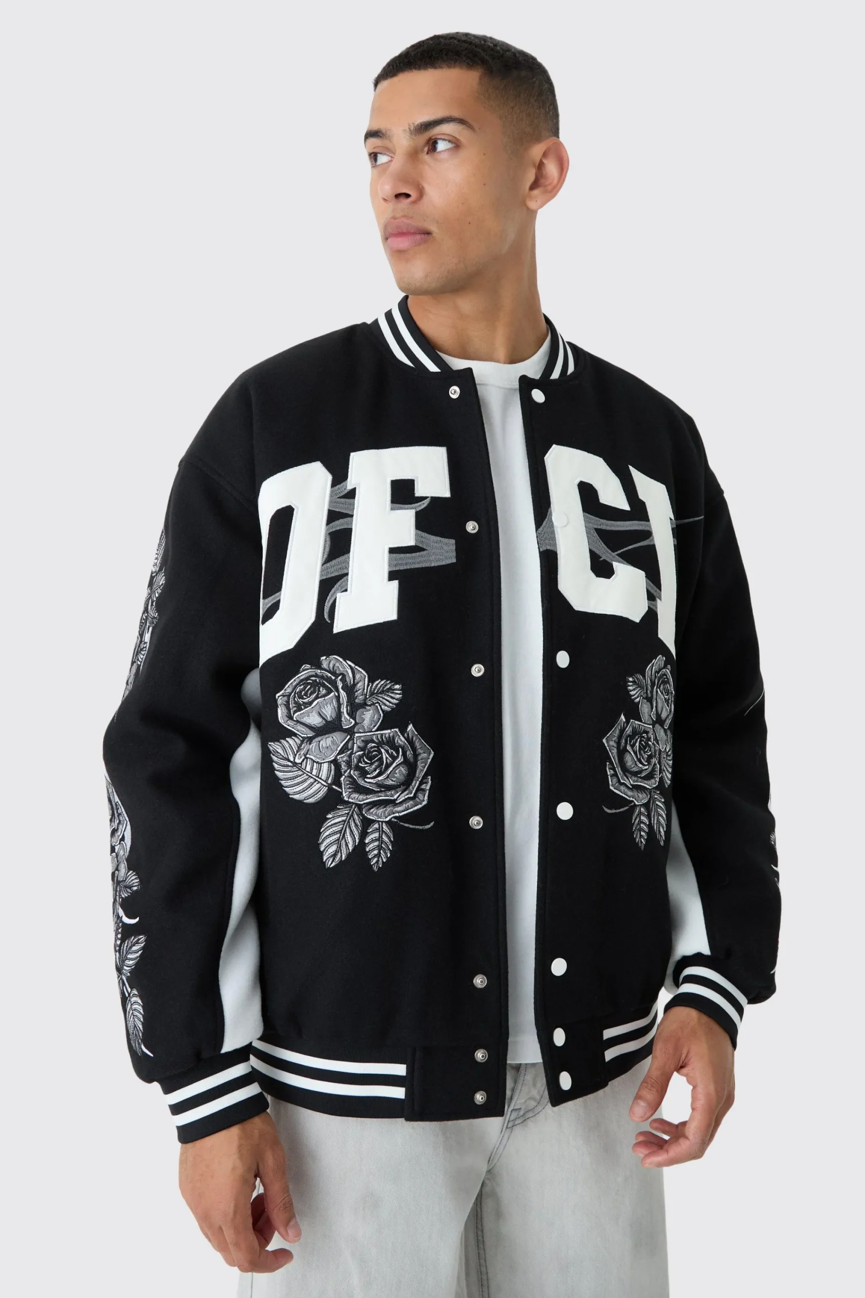 boohooMAN Oversized OFCL Rose Varsity Jacket In | UK| Coats & Jackets