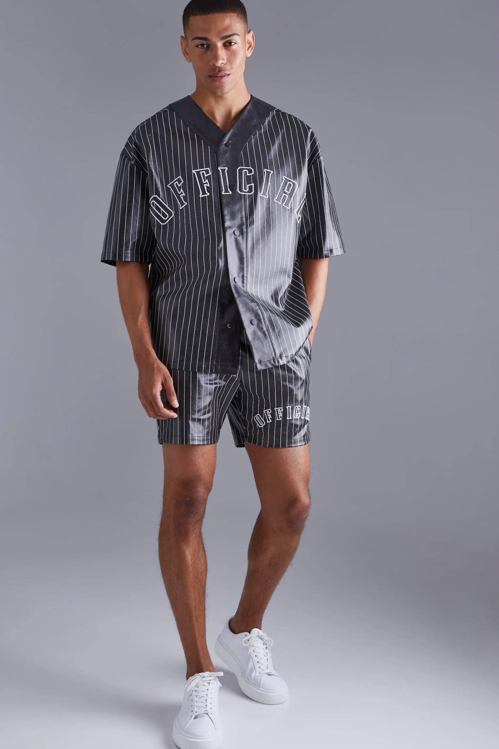 - Striking faux leather shirt and shorts set in a sporty pinstripe design.
