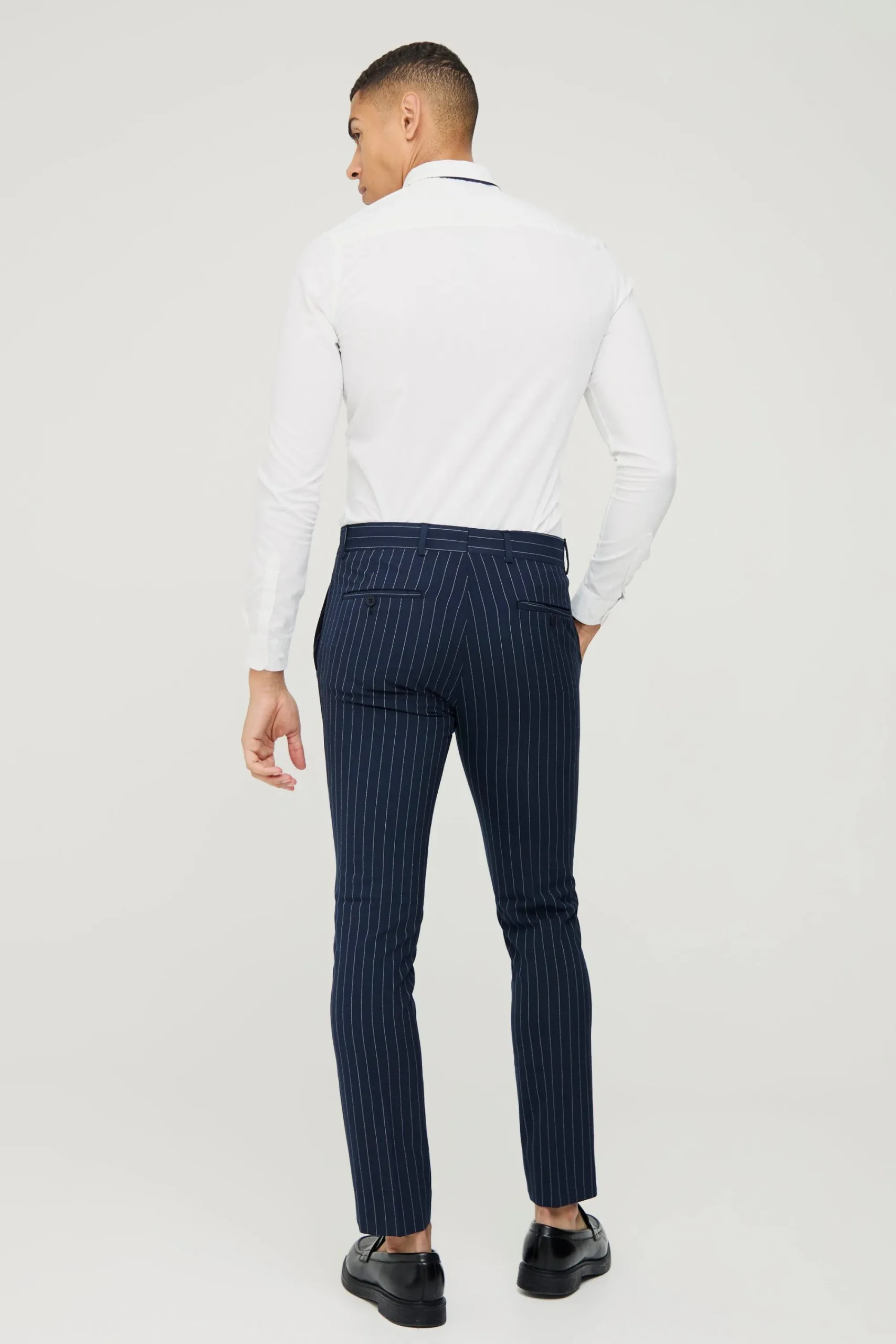 Pinstripe trousers combine modern style with vintage charm.