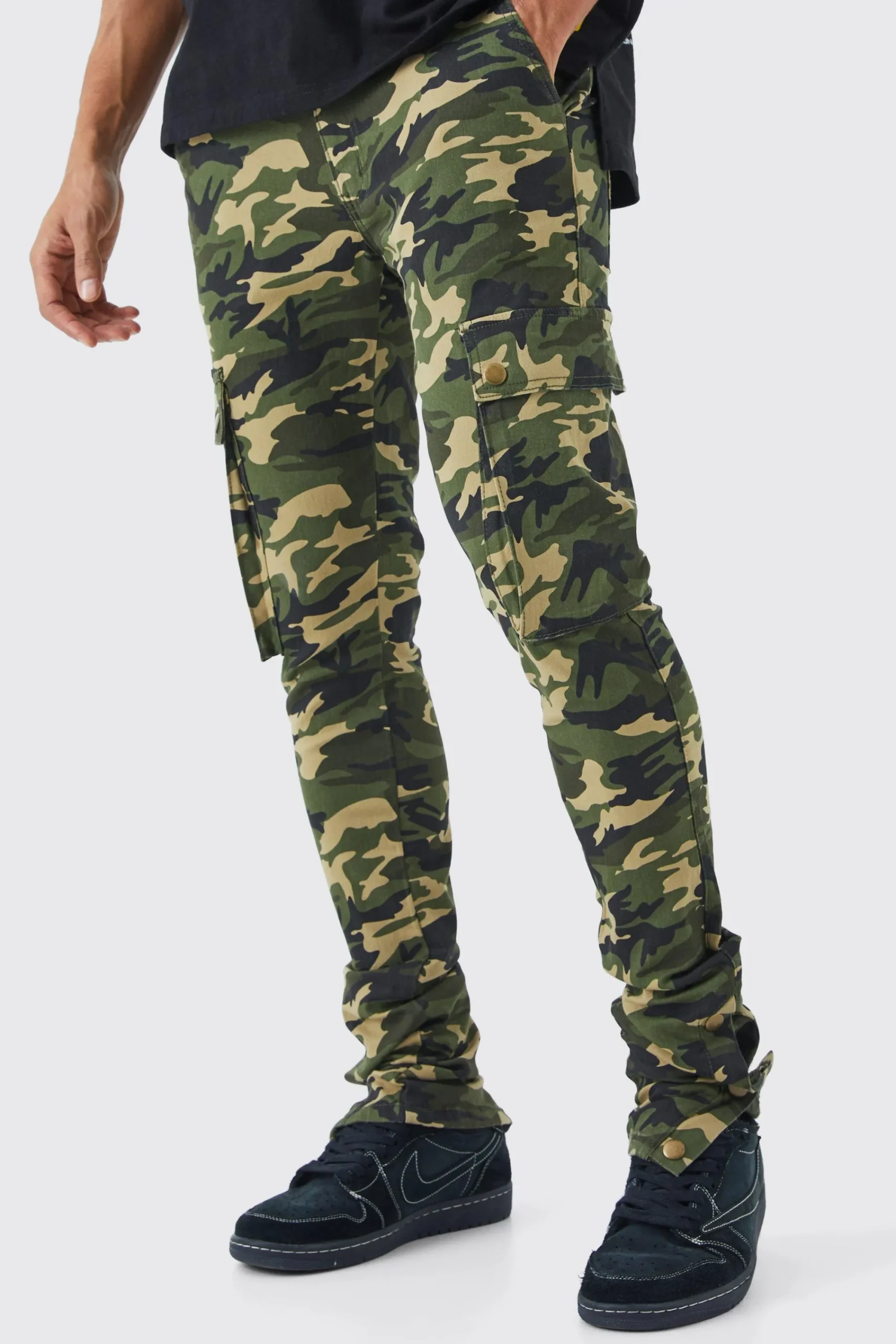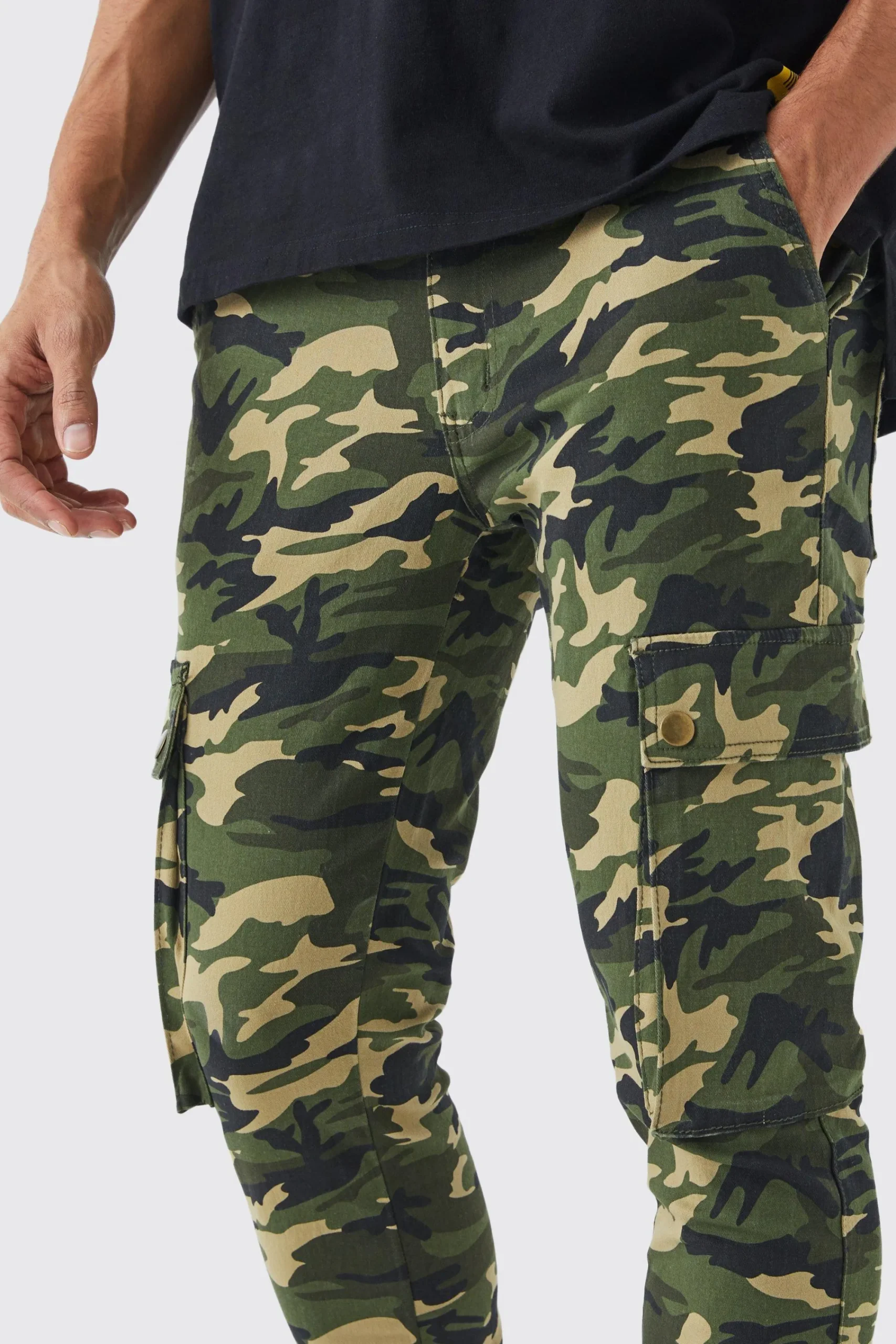 - Military-inspired skinny camo cargo trousers with multiple pockets and popper hem detailing.
