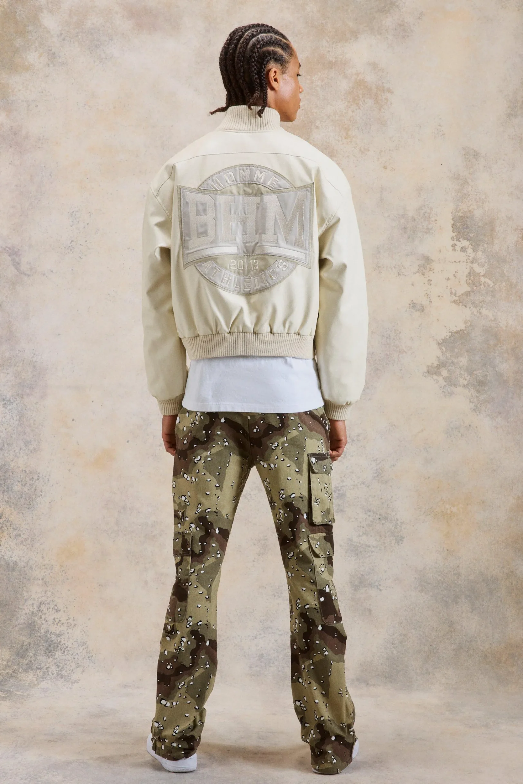 - Military-inspired camo print and flare zip detail add visual interest.