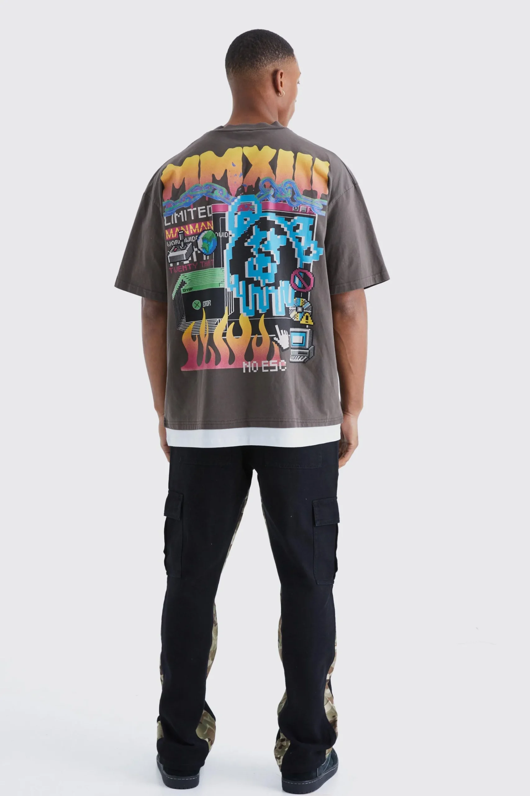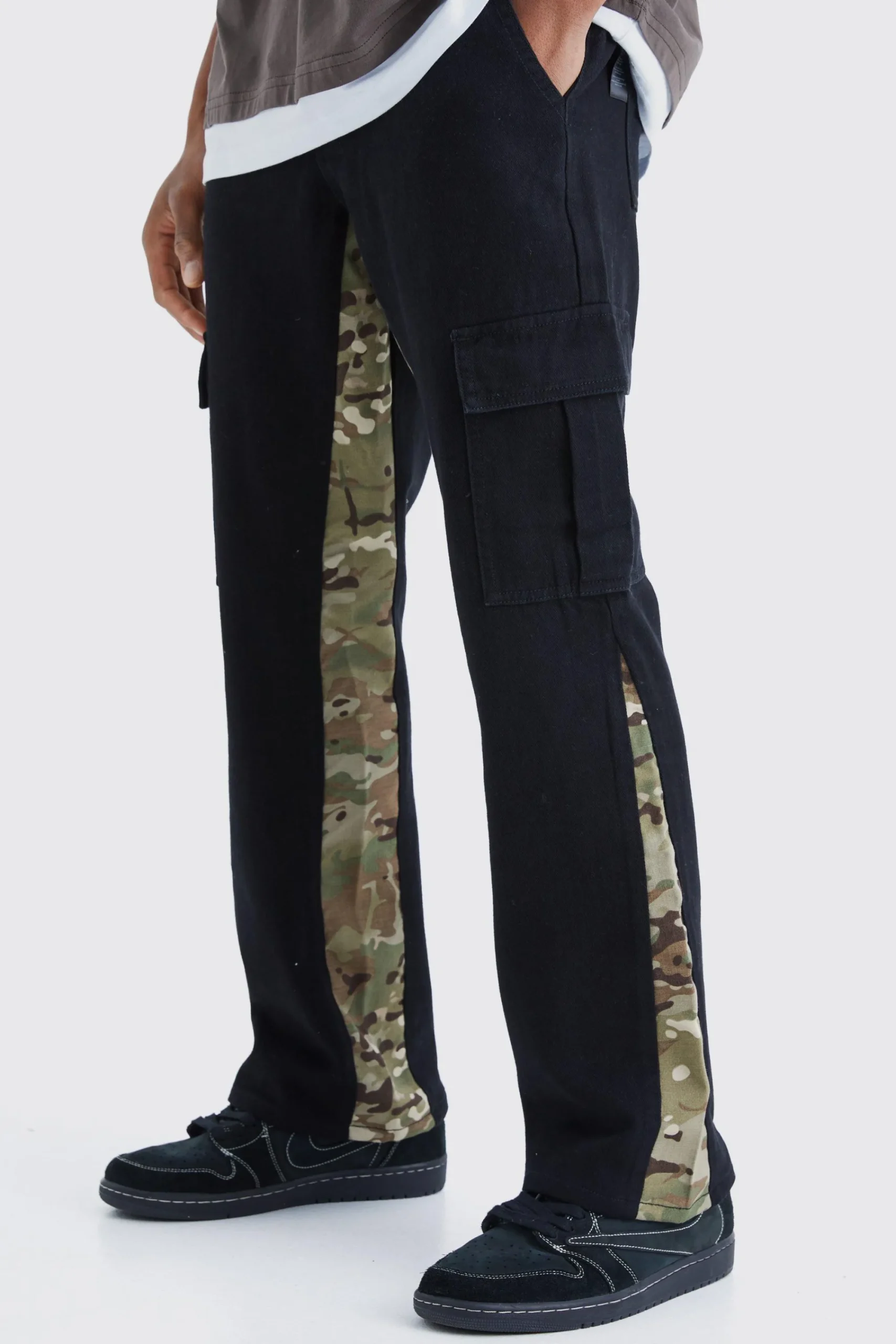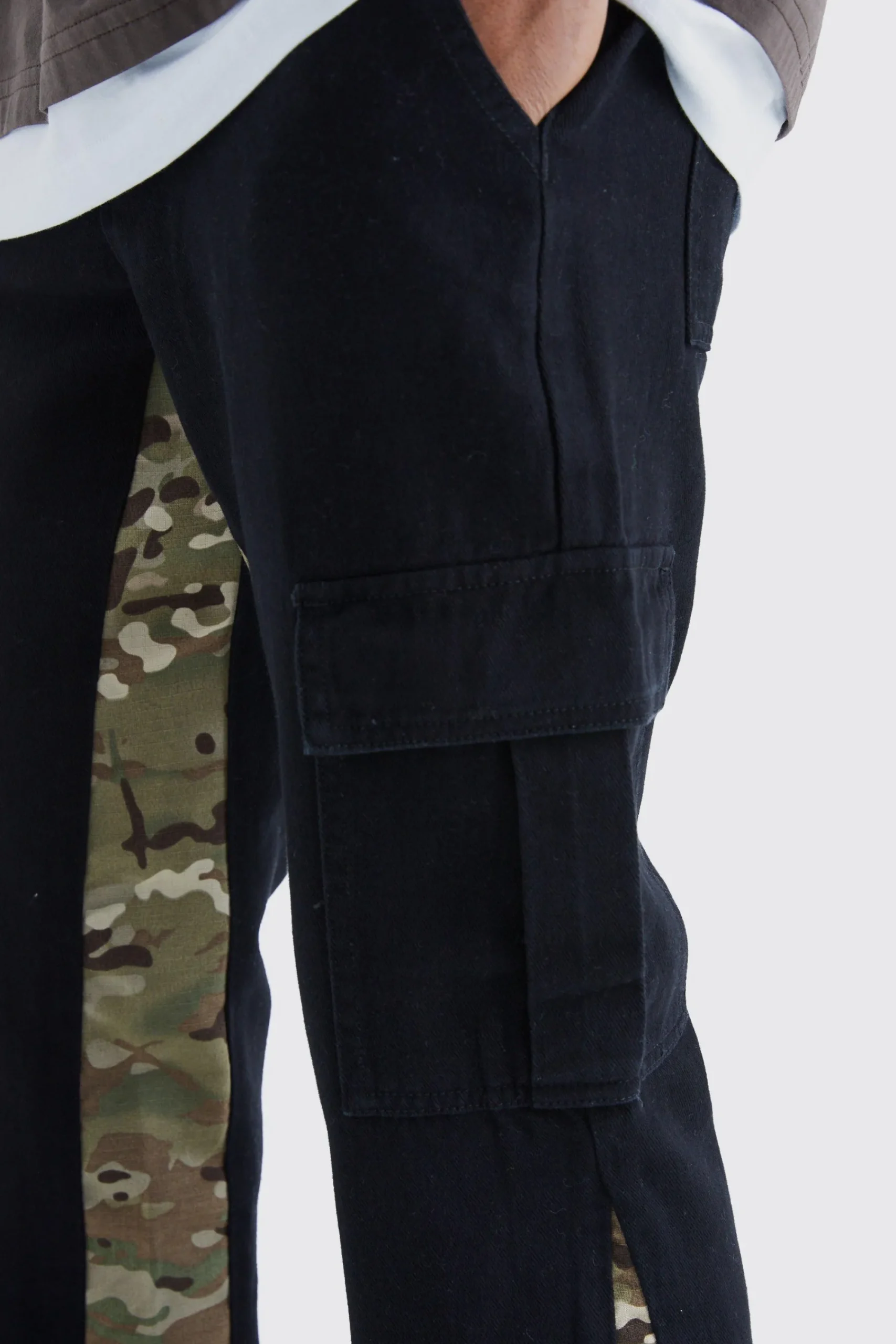 - Military-inspired straight leg trousers with eye-catching camouflage gusset inserts for a utility edge