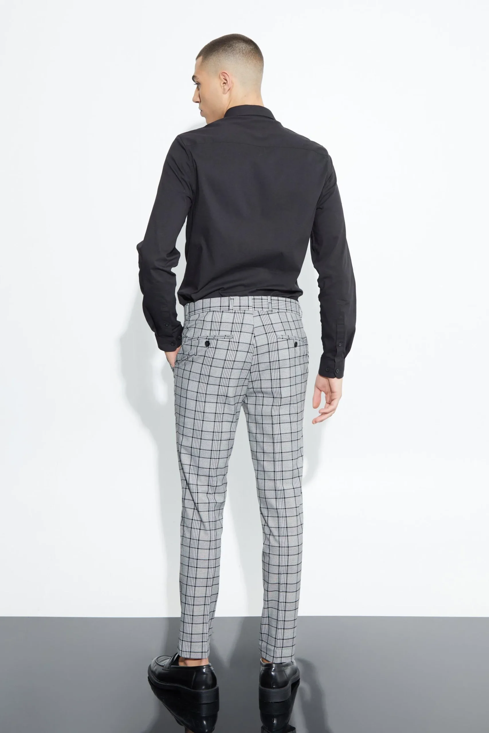 - Eye-catching black check pattern adds stylish update to classic skinny trousers