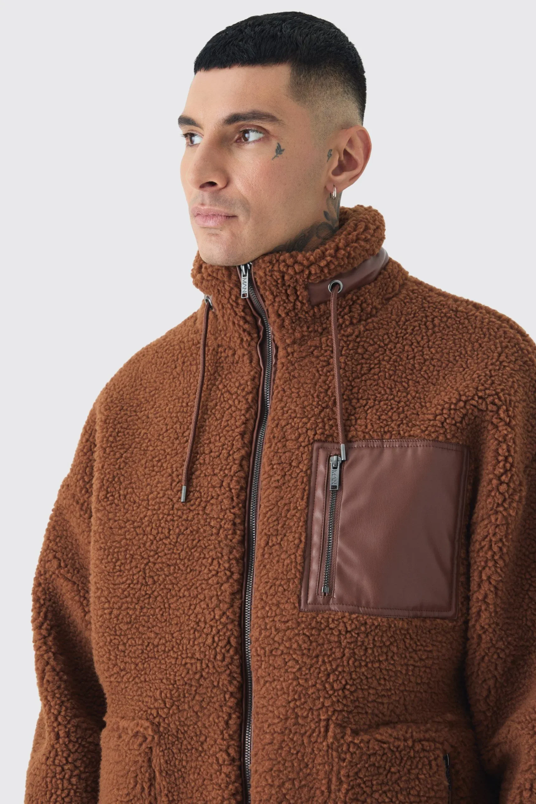100% polyester. Model is 6″4 and wears a size L