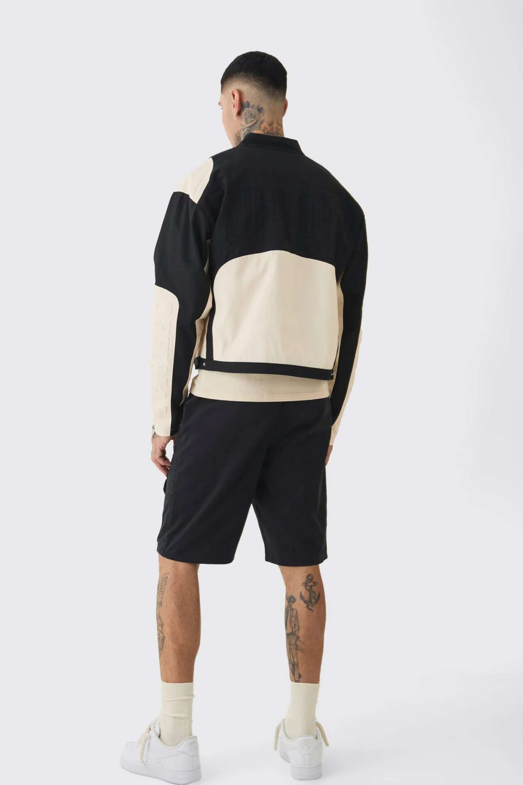 100% cotton. Model is 6″4 and wears a size L.
