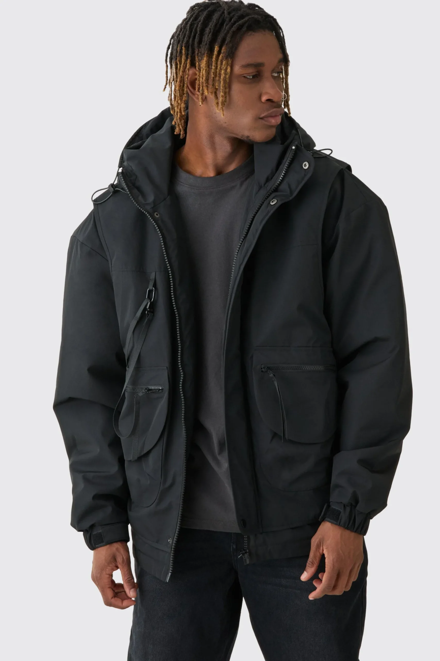 - Neckline: Hooded