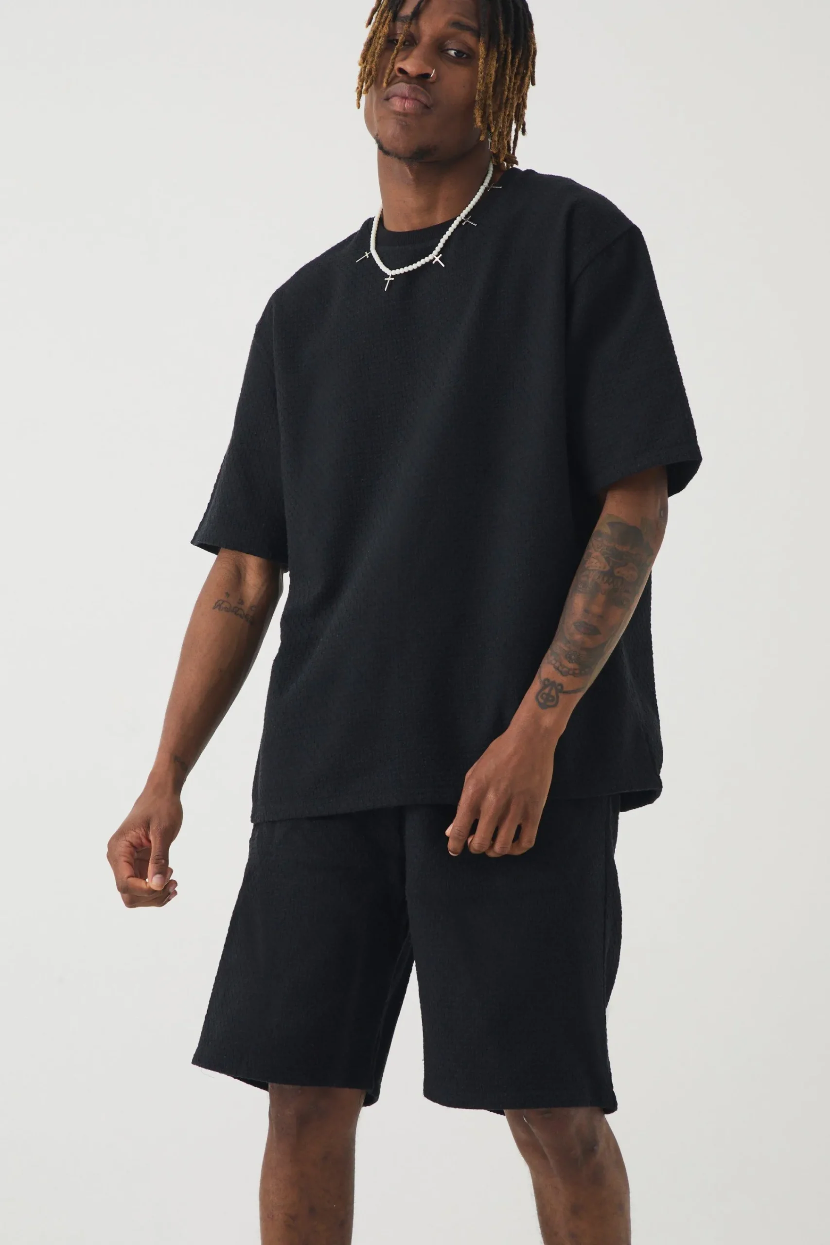 70% polyester 30% cotton. Model is 6″4 and wears a size L.