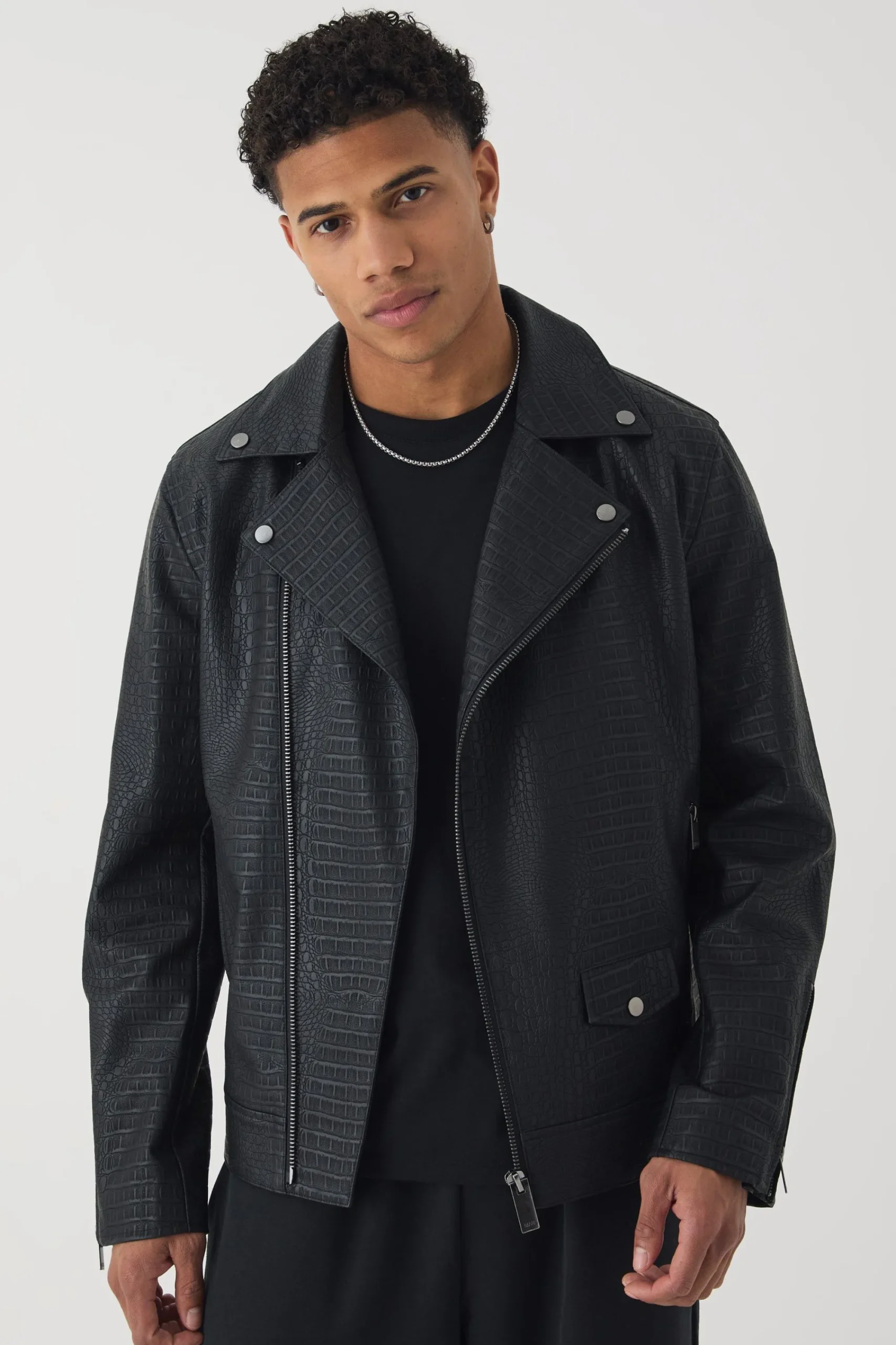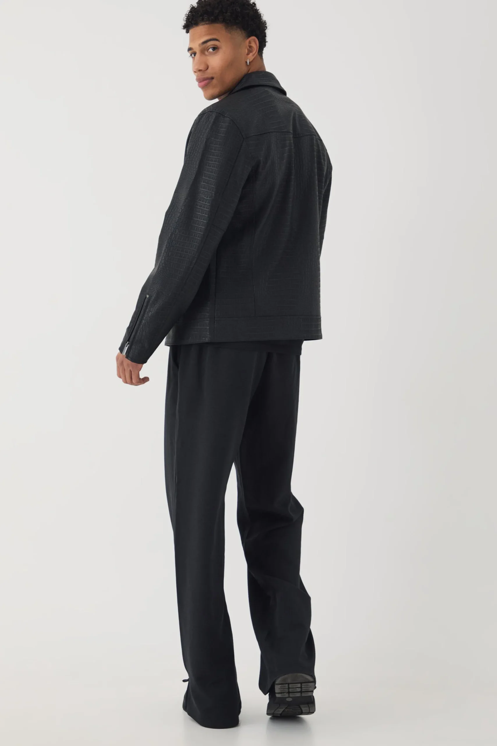 100% PU. Model is 6’1 and wears size M.