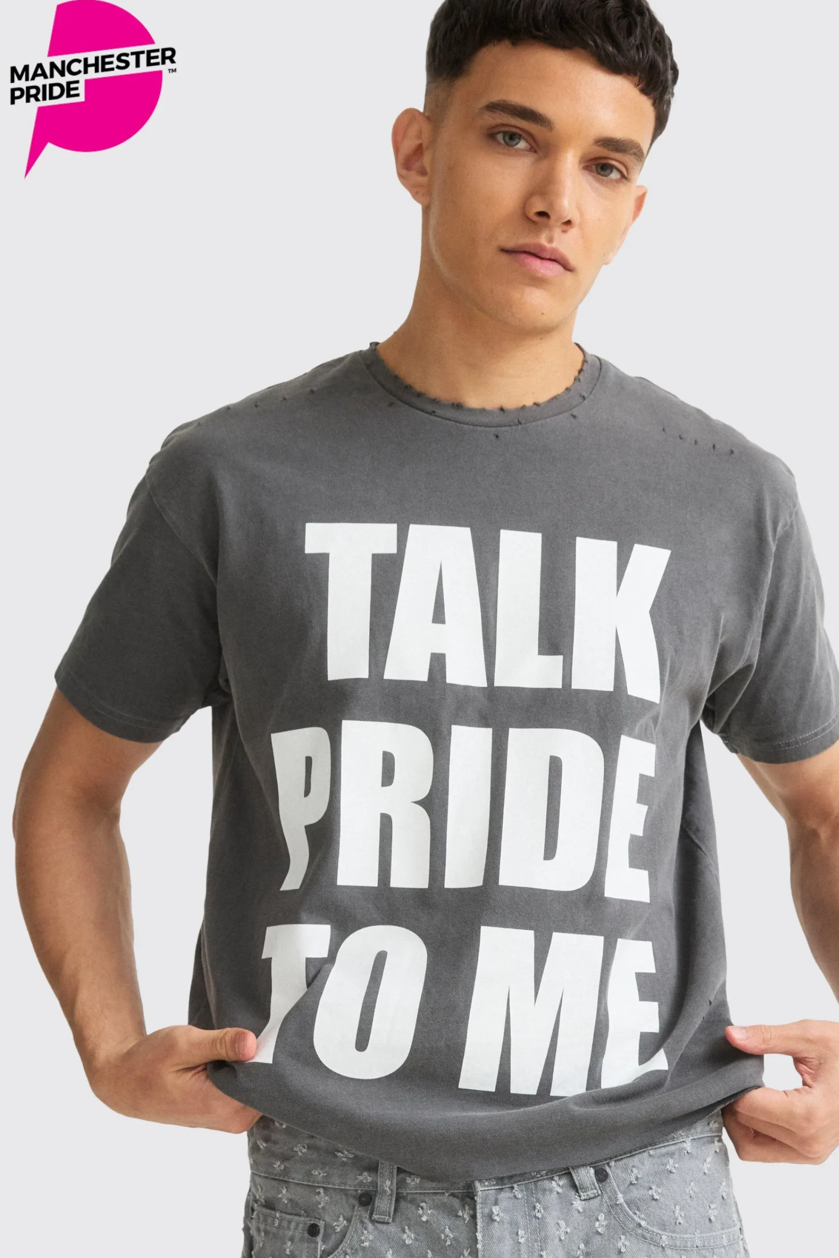 Our promotes self-love, empowerment, and the freedom of expression. Featuring oversized boxy fits and distressed details, these colourful graphic t-shirts are all about having fun. Whether you’re owning the parade or lighting up the dance floor at a Pride party, we’ve got the perfect vibe for you. Pair it with your favourite pair of cargo trousers and chunky trainers for an on point outfit. Plus, 100% of net profits from the sales of each t-shirt will be donated to Manchester Pride.