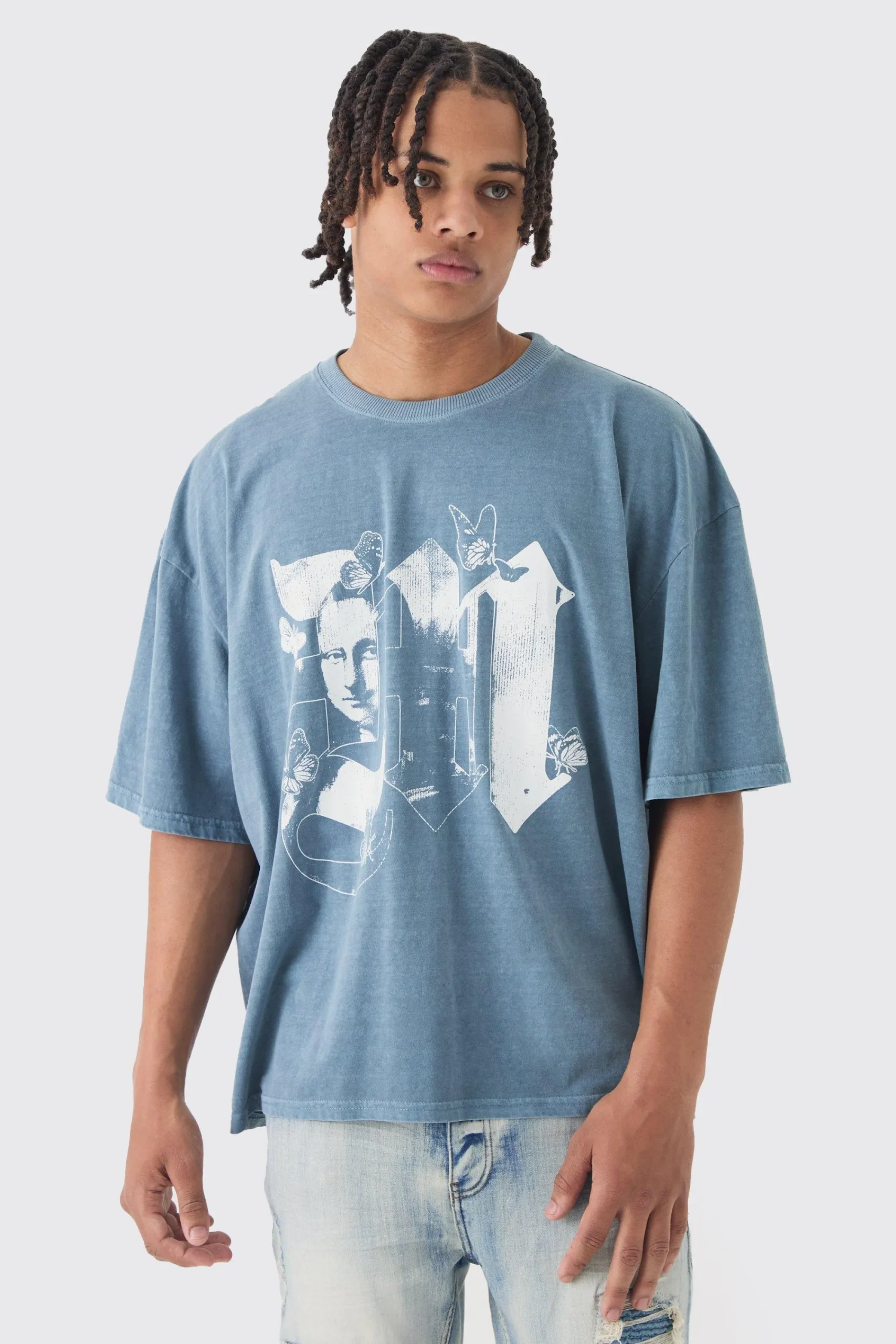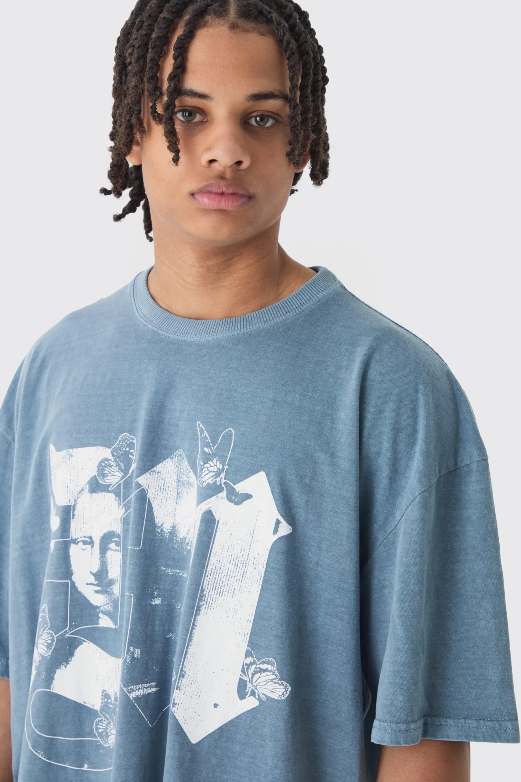 100% Cotton. Model is 6’1 and wears size M.