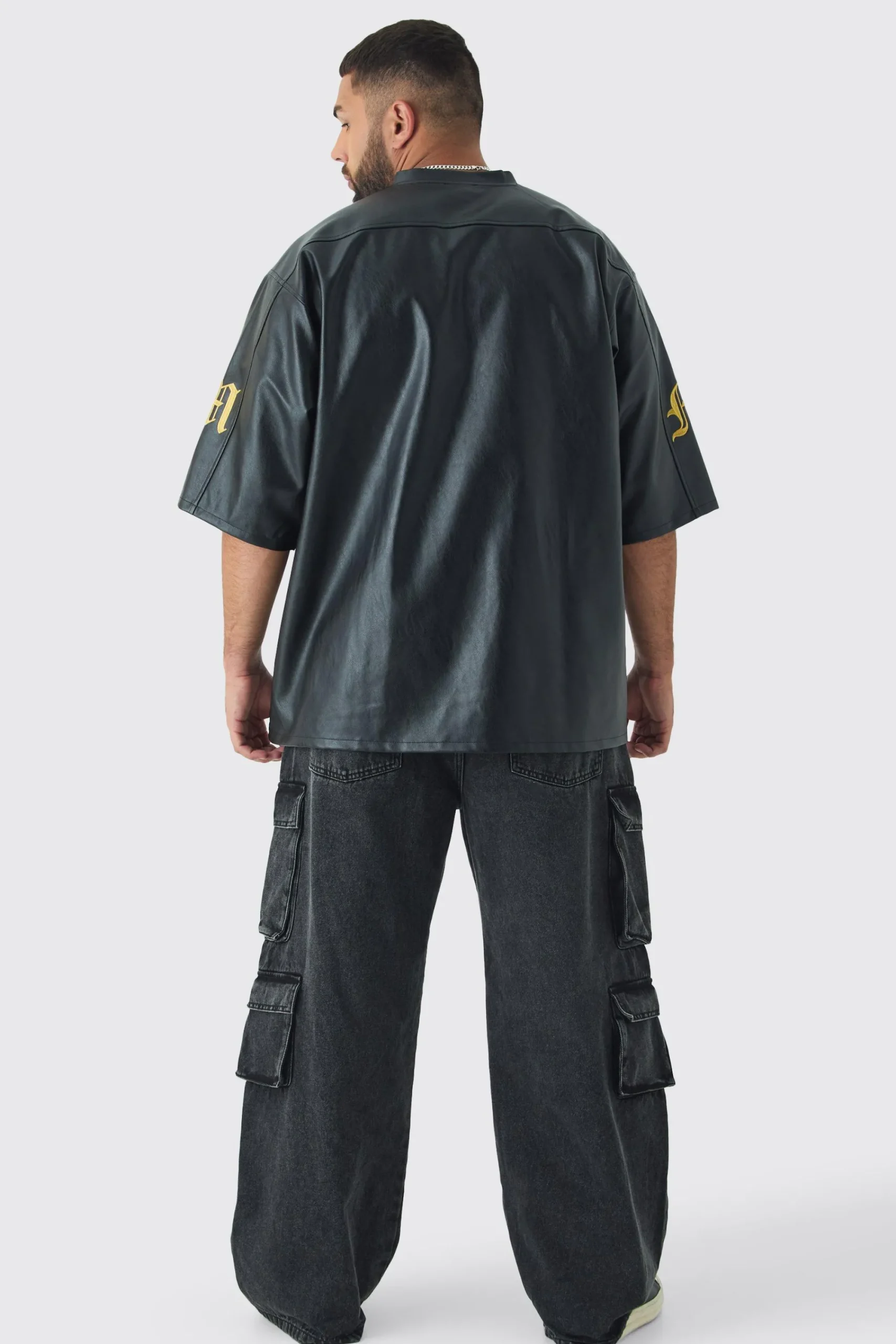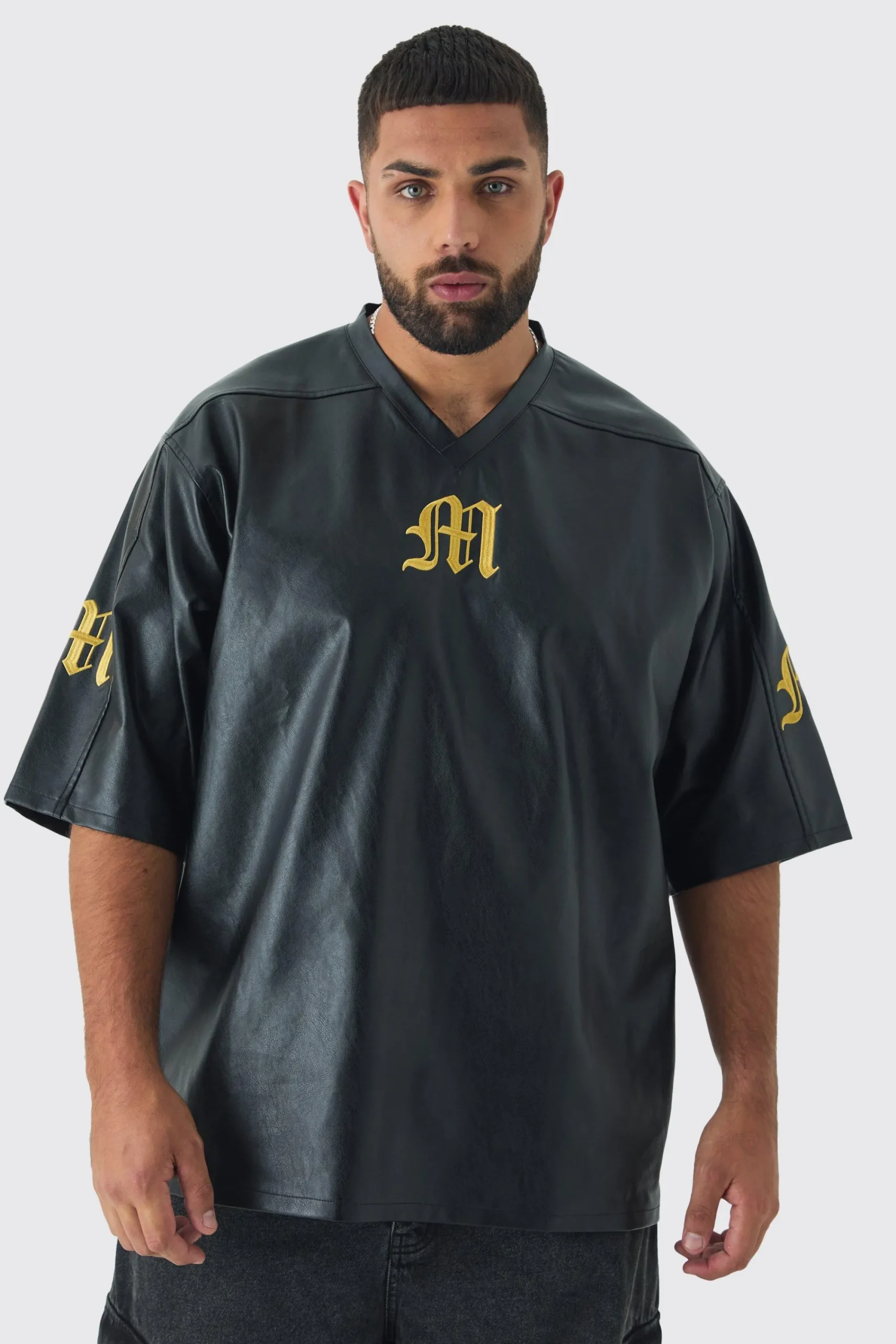 100% polyurethane. Model is 6”1 and wears a size 3XL.