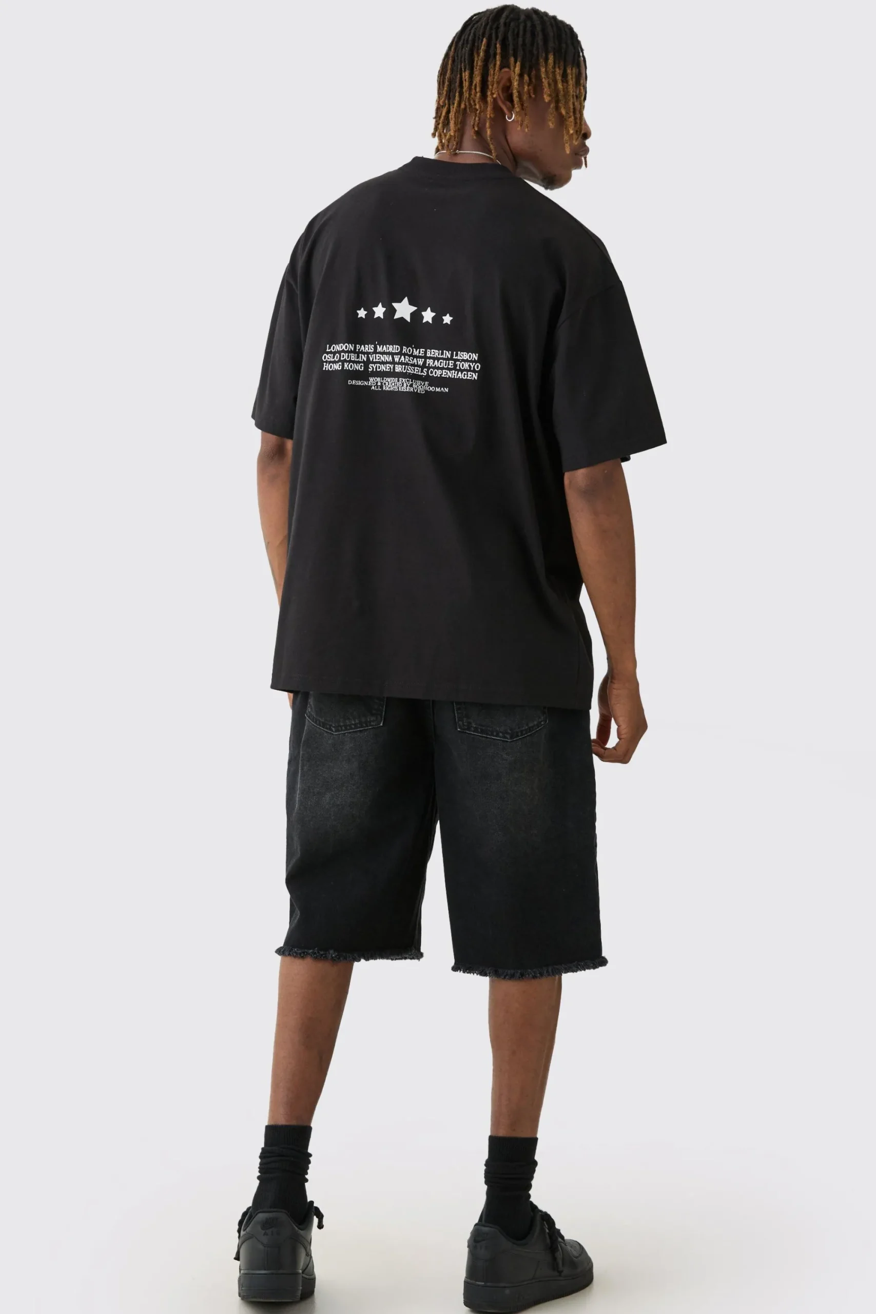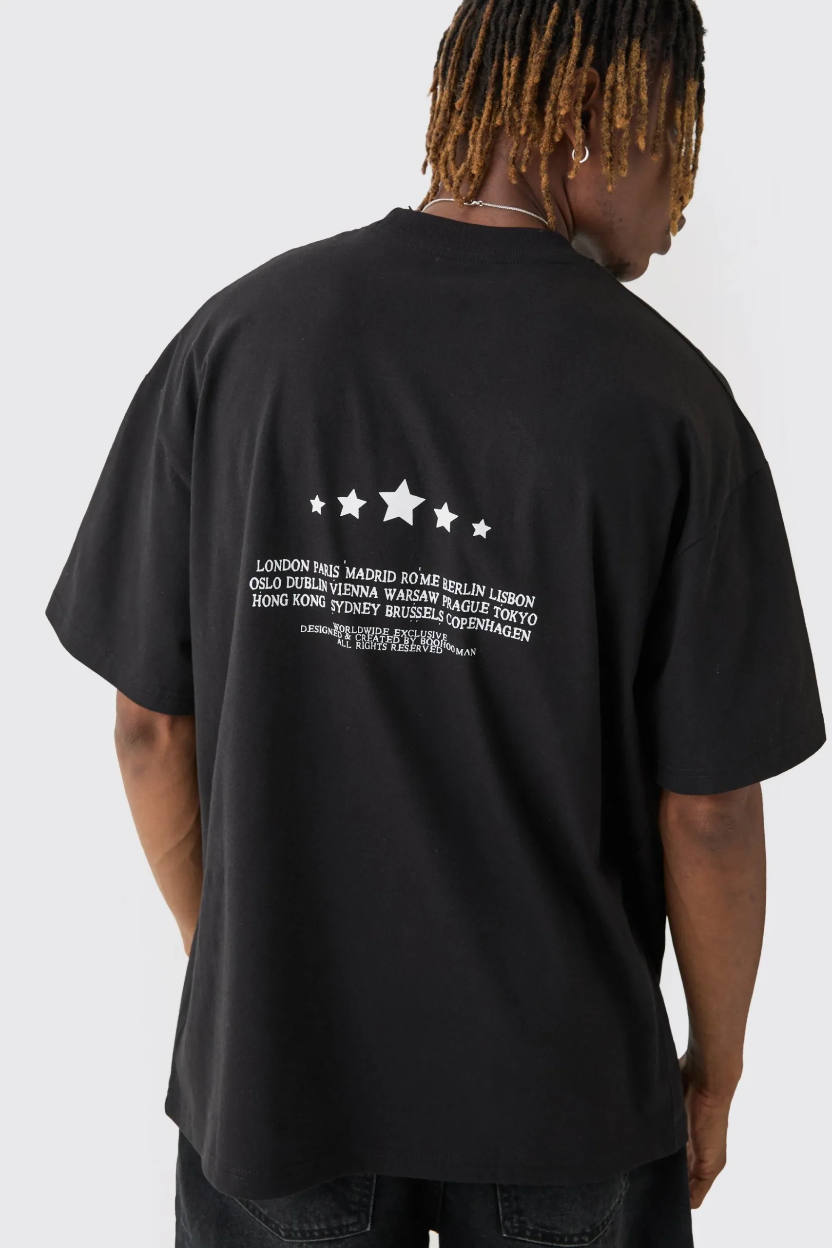 100% cotton. Model is 6″4 and wears a size L.